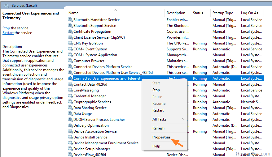 2. In Services control panel, right click at Connected User Experiences and Telemetry service and select Properties.